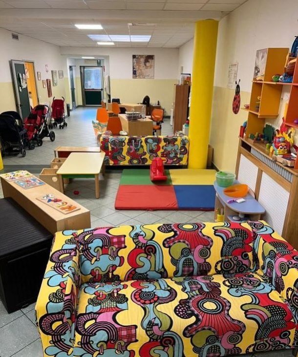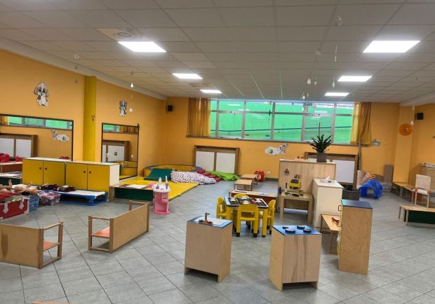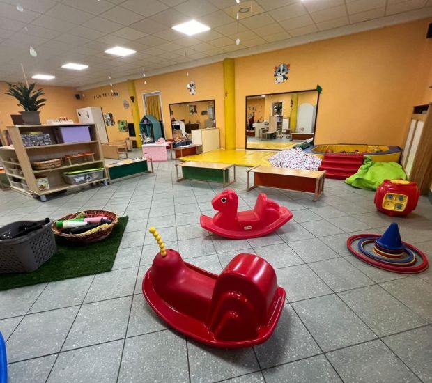 La struttura si trova su un unico piano ed è composta da un ingresso, una zona accoglienza, un ampio open space dove troviamo le diverse zone giorno, una stanza per la nanna, un bagno per i bambini, la cucina e alcuni spazi generali (ufficio coordinatore, spogliatoi personale).